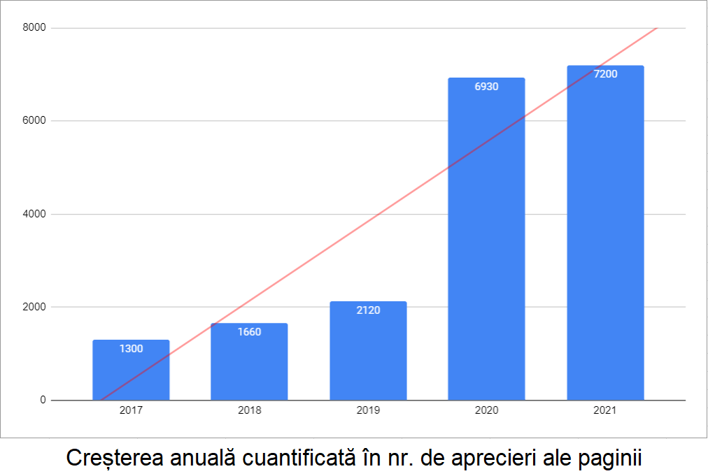 În anul 2018, pagina a crescut cu 1.660 like-uri, rata de creștere fiind de 16,5% rezultând un număr total al aprecierilor paginii de 11.710. În anul 2019, pagina a ajuns la 13.830 aprecieri cu o creștere de 2.120 like-uri, rata de creștere fiind de 18.01%. Anul 2020 a culminat cu o creștere de 50,2%, reprezentând un număr de 6.930 de like-uri, pagina ajungând la un număr total de 20.760 de aprecieri ale paginii. Creșterea ca număr de like-uri pentru anul 2021 a fost de 7.200, rata de creștere de 35,1% rezultând un număr de 27.960 aprecieri ale paginii. În prezent, pagina de Facebook UDJG, înregistrează un număr de 31.780 de aprecieri ale paginii. Impactul total al postărilor de pe pagina de Facebook Universitatea „Dunărea de Jos” din Galați, pentru anul curent, este de peste 1.000.000 de persoane. (sursele sunt indicate la finalul articolului)