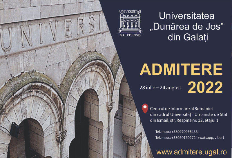 Candidații din UCRAINA care doresc să se înscrie la concursul de admitere la Universitatea „Dunărea de Jos” din Galați pe locuri special alocate (formă de învățământ buget cu bursă sau buget fără bursă) sunt așteptați la Centrul de Informare al României din cadrul Universității Umaniste de Stat din Ismail, din str. Repina nr. 12, etajul 1, în perioada 28 iulie – 24 august 2022.