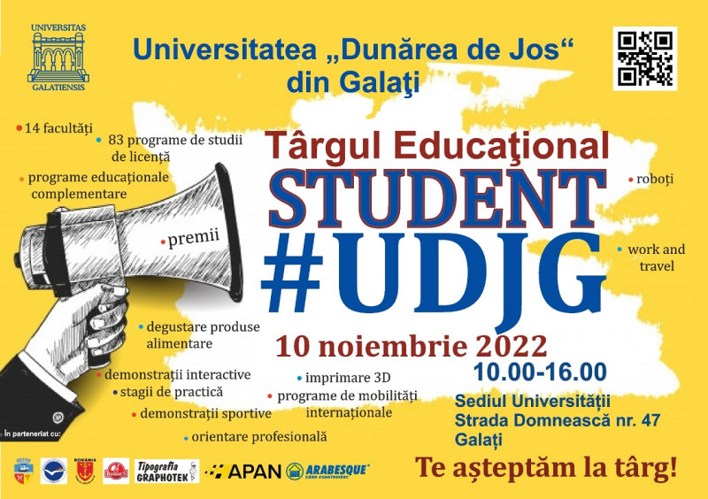 Peste 2.500 de elevi de clasele a X-a, a XI-a și a XII-a din 30 de licee ale județului sunt așteptați mâine la Târgul Educațional Student #UDJG de la Galați, pentru a afla detalii despre programele de studiu și condițiile de cazare din campus oferite de Universitatea „Dunărea de Jos” din Galați. Acțiunea va avea loc în intervalul 10,00-16,00, în holul sediului central din Domnească nr. 47.