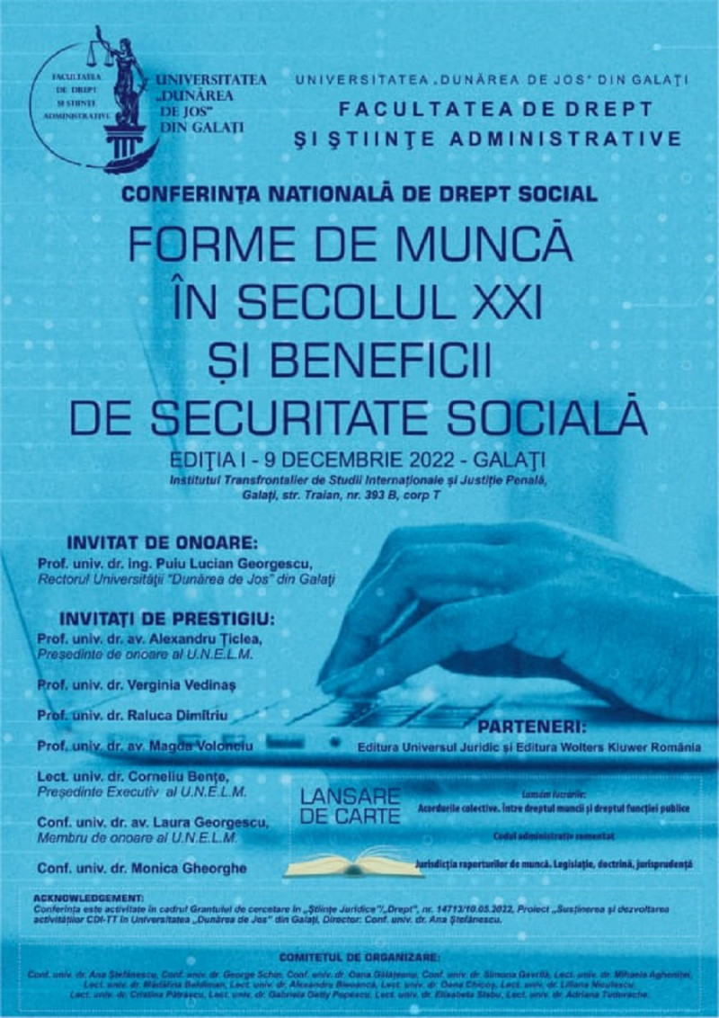 Facultatea de Drept și Științe Administrative din cadrul Universității „Dunărea de Jos” din Galați organizează în data de 9 decembrie 2022, începând cu ora 10,30, prima ediție a Conferinței Naționale de Drept Social, tema aleasă fiind „Forme de muncă în secolul XXI și beneficii de securitate socială”. Invitatul de onoare al conferinței este Rectorul Universității „Dunărea de Jos” din Galați, Prof. univ. dr. Puiu Lucian Georgescu.