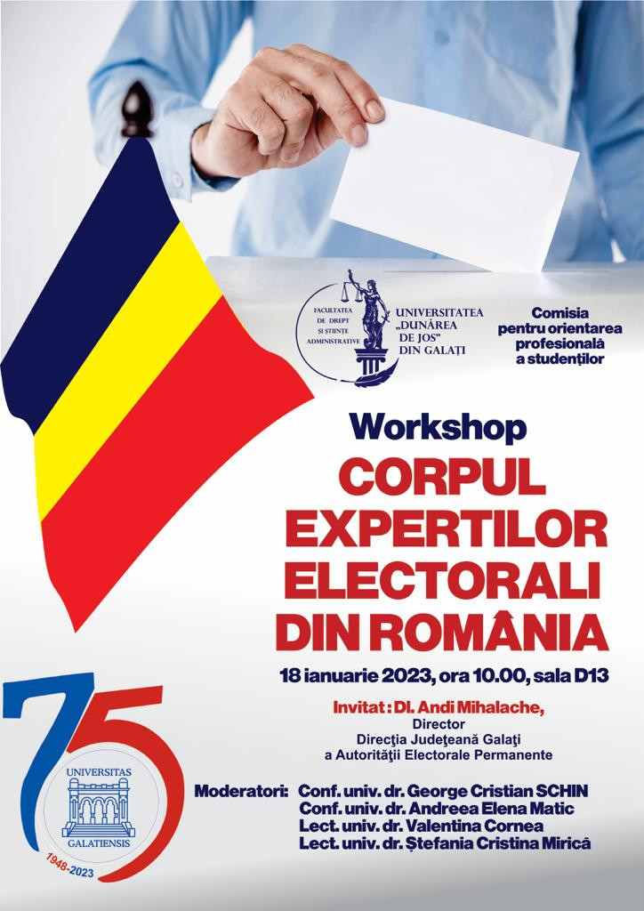 Facultatea de Drept și Științe Administrative din cadrul Universității „Dunărea de Jos” din Galați organizează miercuri, 18 ianuarie Workshop-ul „Corpul Experților Electorali din România”. Evenimentul se desfășoară în baza unui acord de parteneriat cu Direcția Județeană Galați a Autorității Electorale Permanente.