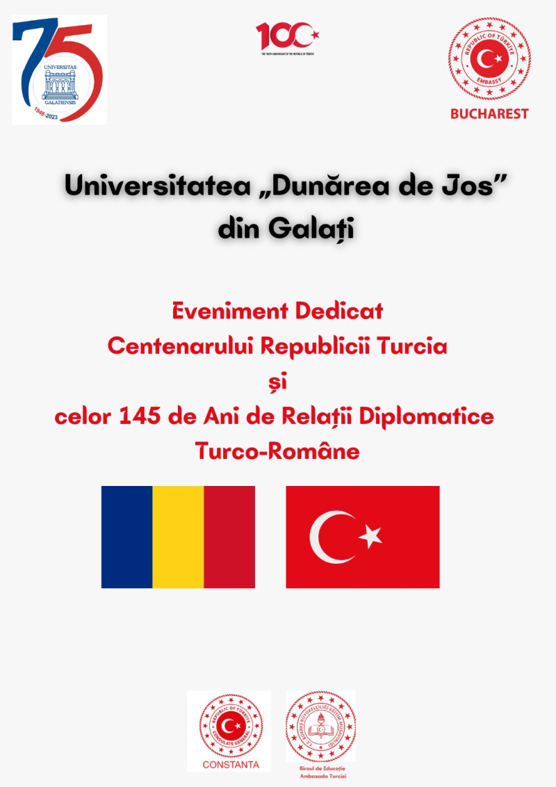 Universitatea ,,Dunărea de Jos” din Galați, în parteneriat cu Ambasada Republicii Turcia la București și Consulatul General al Republicii Turcia din Constanța, organizează, la sediul instituției de învățământ superior din Galați, pe 12 decembrie, de la ora 12,30, un eveniment dedicat Centenarului Republicii Turcia și celor 145 de ani de relații diplomatice turco-române.