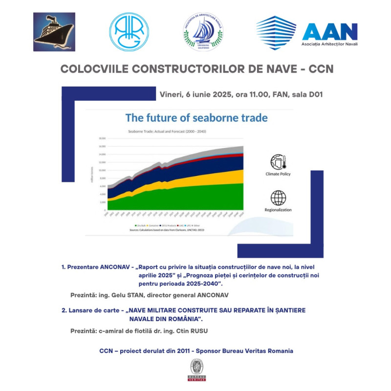Vineri, 6 iunie, începând cu ora 11.00, în Sala D01 a Facultății de Inginerie se va desfășura o nouă ediție a Colocviilor Constructorilor de Nave. În prima parte a evenimentului, organizatorii au pregătit două prezentări din partea ANCONAV: „Raport cu privire la situația construcțiilor de nave noi, la nivel de aprilie 2025” și „Prognoza pieței și cerințelor de construcții noi pentru perioada 2025-2040”, ambele prezentate de ing. Gelu STAN, director general ANCONAV.