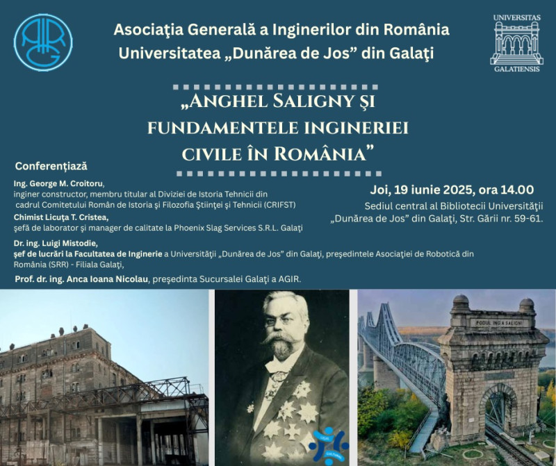 Sucursala Galaţi a Asociaţiei Generale a Inginerilor din România (AGIR) şi Universitatea „Dunărea de Jos” din Galaţi vă invită să participaţi joi, 19 iunie 2025, orele 14.00, la evenimentul „Anghel Saligny şi fundamentele ingineriei civile în România”, eveniment care omagiază activitatea reputatului inginer român. Întâlnirea se va desfăşura la sediul central al Bibliotecii Universităţii „Dunărea de Jos” din Galaţi, din Str. Gării nr. 59-61.