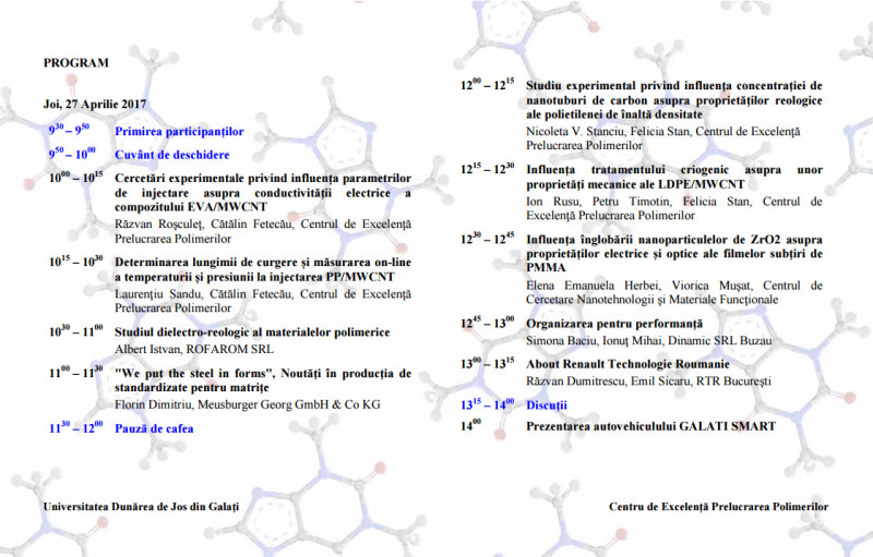Centrul de Excelență Prelucrarea Polimerilor (CE-PP) din cadrul Facultății de Inginerie a Universității „Dunărea de Jos” din Galați organizează cea de-a IX-a ediție a Workshop-ului PROGRESE ÎN FABRICAREA ȘI CONTROLUL PRODUSELOR DIN MATERIALE POLIMERICE.