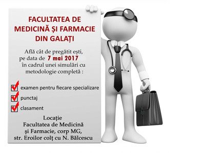 Cei care s-au hotărât deja să urmeze o carieră în medicină, fixându-și drept obiectiv Facultatea de Medicină și Farmacie din cadrul Universității „Dunărea de Jos” din Galați vor avea drept sprijin și în acest an Simularea Examenului de Admitere, organizată pe data de 7 mai 2017 de către Societatea Studenților Mediciniști Galați (SSMG), în corpul MG al Facultății, pe strada Eroilor, colț cu Nicolae Bălcescu, începând cu ora 8.00.