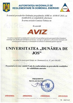 Universitatea „Dunărea de Jos” din Galați, prin Departamentul de Formare Continuă și Transfer Tehnologic (DFCTT), a obținut Avizul Autorității Naționale pentru Reglementare în Domeniul Energiei (ANRE) pentru organizarea și desfășurarea cursurilor de specialitate pentru persoanele fizice/instalatori autorizați care desfășoară activități de proiectare, execuție și exploatare a obiectivelor/sistemelor din domeniul gazelor naturale și a instalațiilor de utilizare în domeniul gazelor naturale.