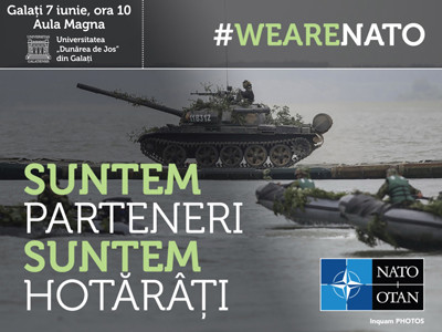 În contextul de securitate actual, dar și al respectării angajamentelor de apărare colectivă asumate de România în cadrul alianței NATO, Universitatea „Dunărea de Jos” din Galați, prin Institutul Transfrontalier de Studii Internaționale și Justiție Penală, va găzdui joi, 7 iunie 2018, începând cu ora 10.00, evenimentul de informare publică #WeAreNATO organizat în parteneriat cu Comisia pentru apărare, ordine publică și siguranță națională din cadrul Camerei Deputaților și Consiliul Județean Galați, cu sprijinul Ministerului Apărării Naționale, Ministerului Afacerilor Externe, Ministerului Educației Naționale, precum și al Jandarmeriei Române.