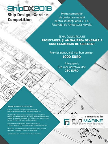 Vineri, 8 iunie, începând cu ora 12.00, în sala de Conferințe de la Bazinul de Carene (strada Domnească nr. 111), vor avea loc prezentările finale din cadrul concursului Ship DX 2018, organizat de compania GLO Marine în colaborare cu Facultatea de Arhitectură Navală.