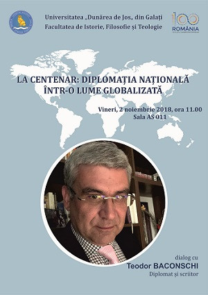 Vineri, 2 noiembrie, Universitatea „Dunărea de Jos” din Galați îl va avea ca invitat pe domnul Teodor Baconschi - teolog, diplomat, scriitor, fost Ministru de externe al României, care va susține conferința intitulată „La Centenar: Diplomația națională într-o lume globalizată”.
