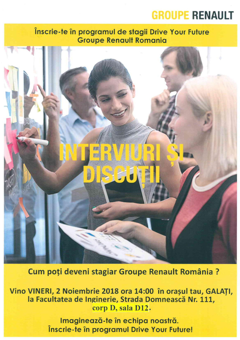 Vineri, 2 noiembrie 2018, la ora 14,00, la Facultatea de Inginerie cu sediul în strada Domnească nr. 111, corp D, sala D12, va avea loc întâlnirea reprezentanților Groupe Renault Romania cu studenții gălățeni, pentru recrutarea în programul de stagii Drive Your Future.