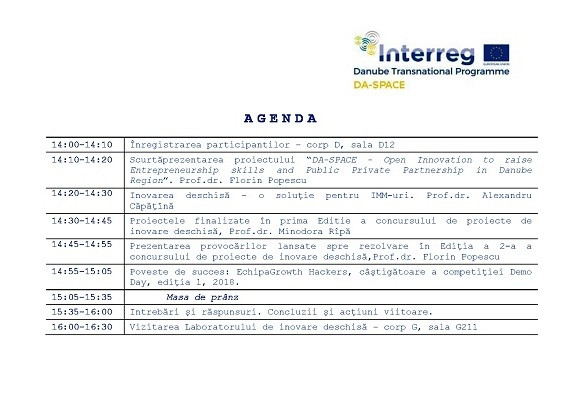 Proiectul cu titlul „DA-SPACE - Creșterea abilităților antreprenoriale și a parteneriatului public privat, prin inovare deschisă, în regiunea Dunării” are ca obiectiv principal crearea și implementarea a șapte laboratoare de inovare deschis în șapte regiuni riverane Dunării.
