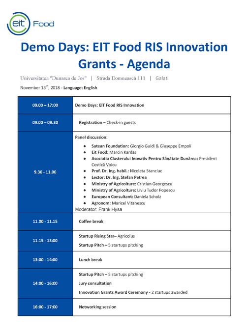 La conferință vor participa reprezentanți ai Universității din Varșovia (care sunt reprezentanții AM pentru programul EIT-Food), reprezentanți ai Facultății de Știința și Ingineria Alimentelor din cadrul Universității „Dunărea de Jos" din Galați (care vor prezenta contextul cercetării în sectorul agroalimentar), un reprezentant al Companiilor/ Asociațiilor agricole (care va prezenta contextul real al sectorului agricol) și 10 start-up-uri care vor reflecta ideile lor de afaceri inovatoare în sectorul agroalimentar (selectate din toate cele înscrise în program). Totodată, în cadrul conferinței, vor fi selectate primele două companii care vor fi premiate cu un grant de 10.000 euro (prima) și un grant de 5.000 euro (a doua), cât și doi reprezentanți ai Ministerului Agriculturii și Dezvoltării Rurale, care vor prezenta submăsurile 16.1/16.1a din PNDR care vizează inovarea și dezvoltarea de proiecte pilot prin intermediul grupurilor operaționale.