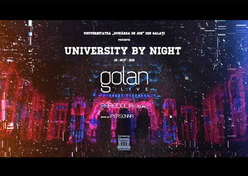 University by Night este genericul evenimentului la care Universitatea „Dunărea de Jos” din Galați vă invită joi, 29 noiembrie 2018, începând cu ora 19.00. Fațada sediului central al Universității din strada Domnească nr. 47 va prinde viață sub efectele magice ale artistului vizual Pareidolia. De ambientul muzical se va ocupa Personna.