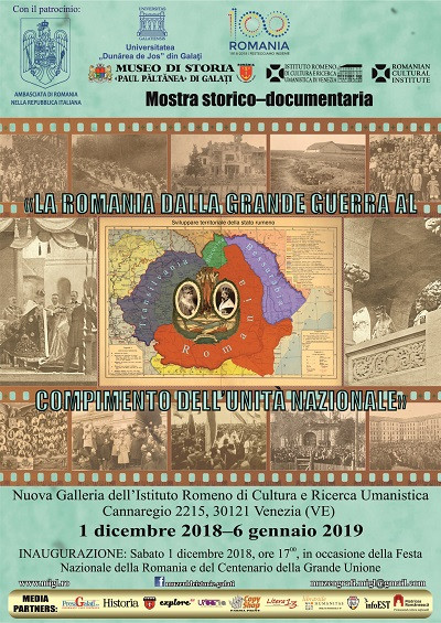 Sâmbătă 1 decembrie 2018, la ora 17.00, cu prilejul celebrării Zilei Naţionale a României şi Centenarului Marii Uniri, în Noua Galerie a Institutului Român de Cultură şi Cercetare Umanistică de la Veneţia va avea loc vernisajul expoziţiei istorico–documentare «România de la Marele Război la Marea Unire/La Romania dalla Grande Guerra al compimento dell’Unità nazionale», curatoriată de d-na muzeograf Mihaela Damian şi organizată de Muzeul de Istorie „Paul Păltănea” şi Universitatea „Dunărea de Jos” din Galaţi, în parteneriat cu instituţia românească din oraşul istoric italian, sub patronajul Ambasadei României în Italia.