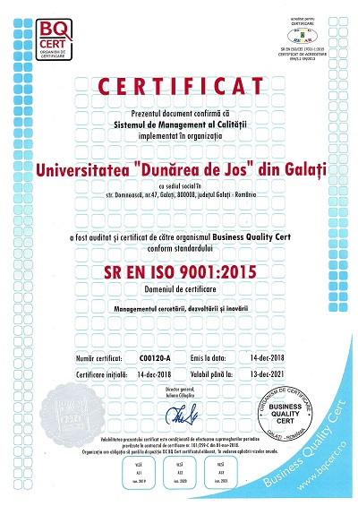 Acordarea acestui certificat universității gălățene se datorează aplicării proiectului cu titlul Armonizarea trinomului educație-calitate-etică cu exigențele învățământului superior european (ADEQUATE) - CNFIS-FDI-2018-0261.