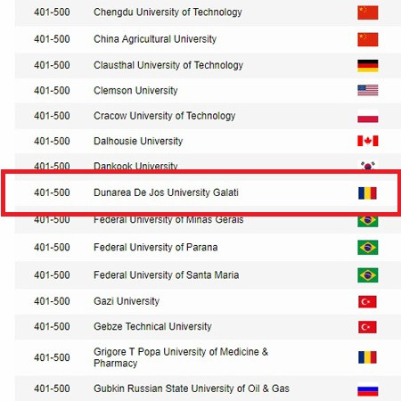 Universitatea „Dunărea de Jos” din Galați a fost clasificată, de către Shanghai Ranking's Global Ranking of Academic Subjects 2018, în Top 500 universități din lume, ca urmare a contribuțiilor științifice (articole publicate, participări la conferințe etc.) din domeniul Inginerie chimică. Aceste contribuții publicate în reviste relevante de pe fluxul principal pe plan mondial reprezintăcercetări interdisciplinare realizate de colective de cadre didactice și tineri cercetători din domenii conexe, în care universitatea are performanțe deosebite, și anume: chimie multidisciplinară, știința și ingineria alimentelor, biotehnologii, știința materialelor, eco-nanotehnologii și materiale avansate și sănătate.
