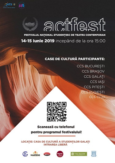 Casa de Cultură a Studenţilor Galaţi organizează, în perioada 14-15 iunie 2019, Festivalul Naţional Studenţesc de Teatru Contemporan "ActFest", ediţia a VII-a. Festivalul se desfăşoară sub formă de competiţie, la care participă trupele de teatru afiliate caselor de cultură studenţeşti din ţară.