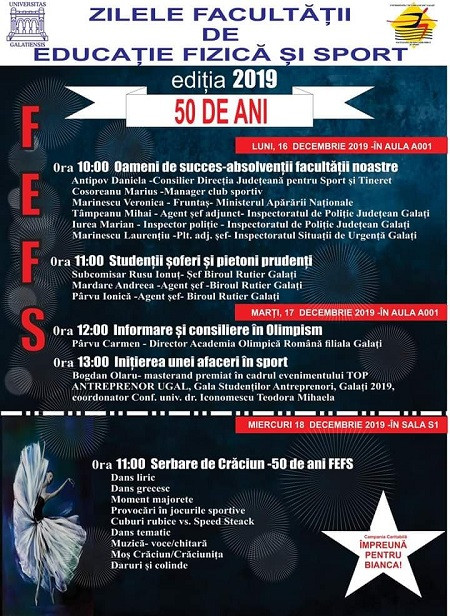 În perioada 16-18 decembrie se desfășoară Zilele Facultății de Educație Fizică și Sport, ediție specială, prilejuită de aniversarea a 50 de ani de la înființarea Facultății.