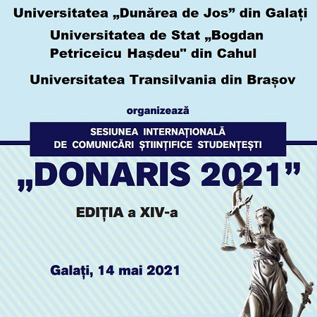 Sesiunea Științifică Internațională Studențească „Donaris 2021", ajunsă la a XIV-a ediție, este un eveniment științific organizat de Universitatea „Dunărea de Jos" din Galați, prin Facultatea de Ştiinţe Juridice, Sociale şi Politice în parteneriat cu Universitatea de Stat „Bogdan Petriceicu Hasdeu" din Cahul, prin Facultatea de Drept și Administrație Publică și Universitatea Transilvania din Brașov, prin Facultatea de Drept, dedicat în exclusivitate studenților de la specializările drept și administrație publică.