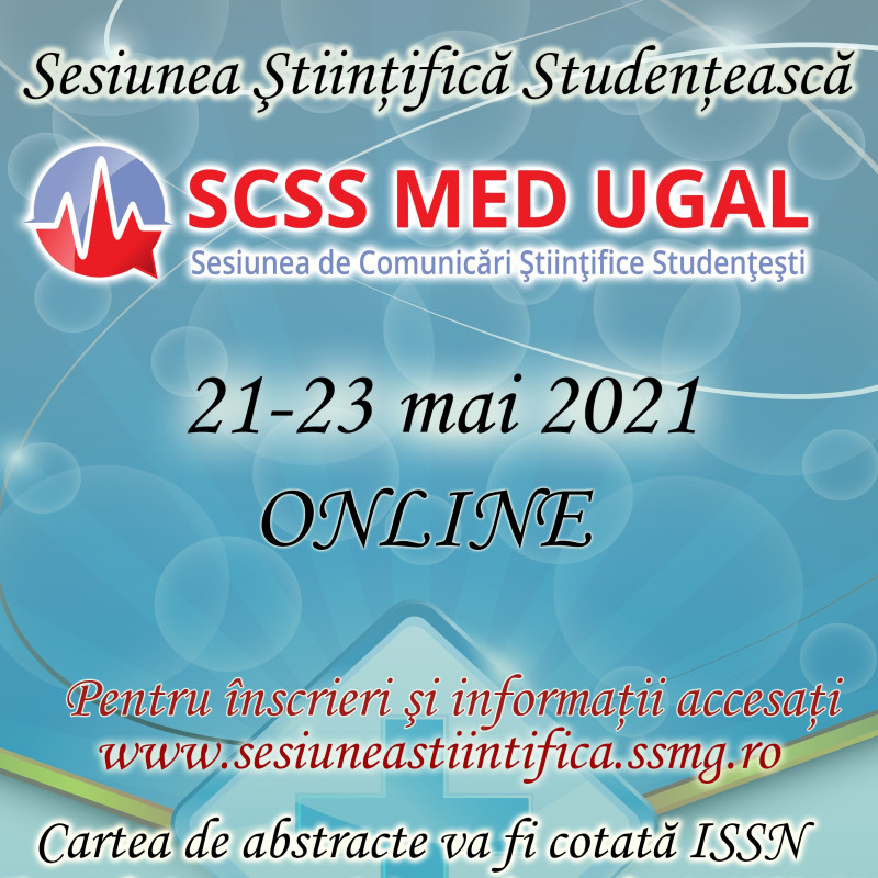 Societatea Studenților Mediciniști Galați (SSMG) și Facultatea de Medicină și Farmacie organizează, sub patronajul Universității „Dunărea de Jos” din Galați, Sesiunea de Comunicări Științifice Studențești „MEDUGAL 2021”. Evenimentul va avea loc în perioada 21-23 mai 2021 și este adresat studenților înscriși la toate programele de licență ale Facultății de Medicină și Farmacie din Galați.