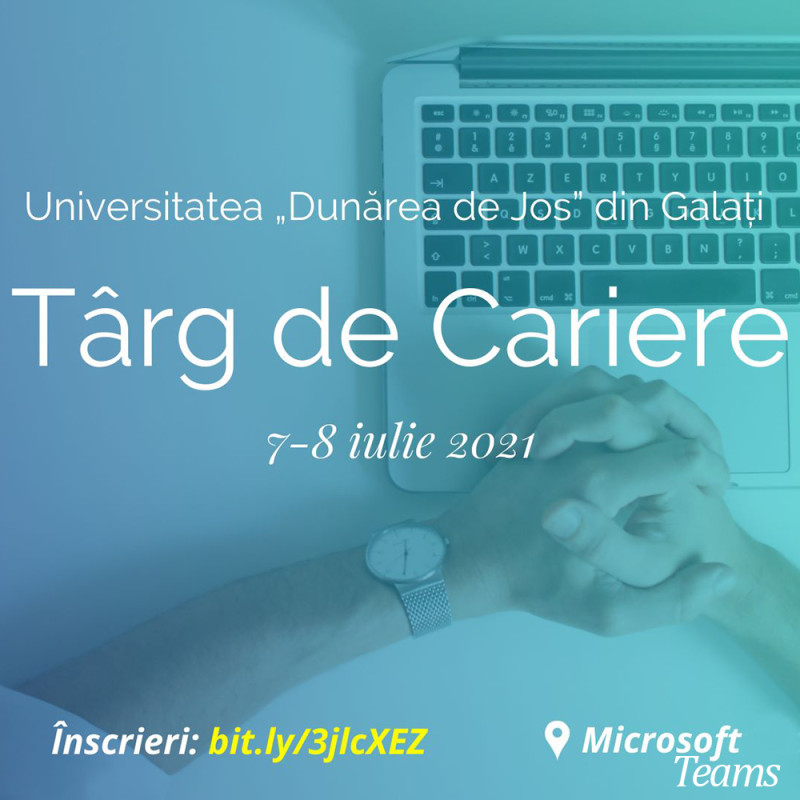 Centrul de Consiliere și Orientare în Carieră organizează în perioada 7-8 iulie 2021 „Târgul de Cariere” pentru studenții și absolvenții Universității „Dunărea de Jos” din Galați. Evenimentul va fi organizat exclusiv online, pe platforma Microsoft Teams. Vor fi prezente 14 companii care își vor prezenta fiecare ofertă disponibilă (stagii de practică, internshipuri, joburi part-time sau full-time, burse), precum și alte informații de interes pentru studenți și absolvenți (ex. Tips & tricks pentru interviul de angajare).
