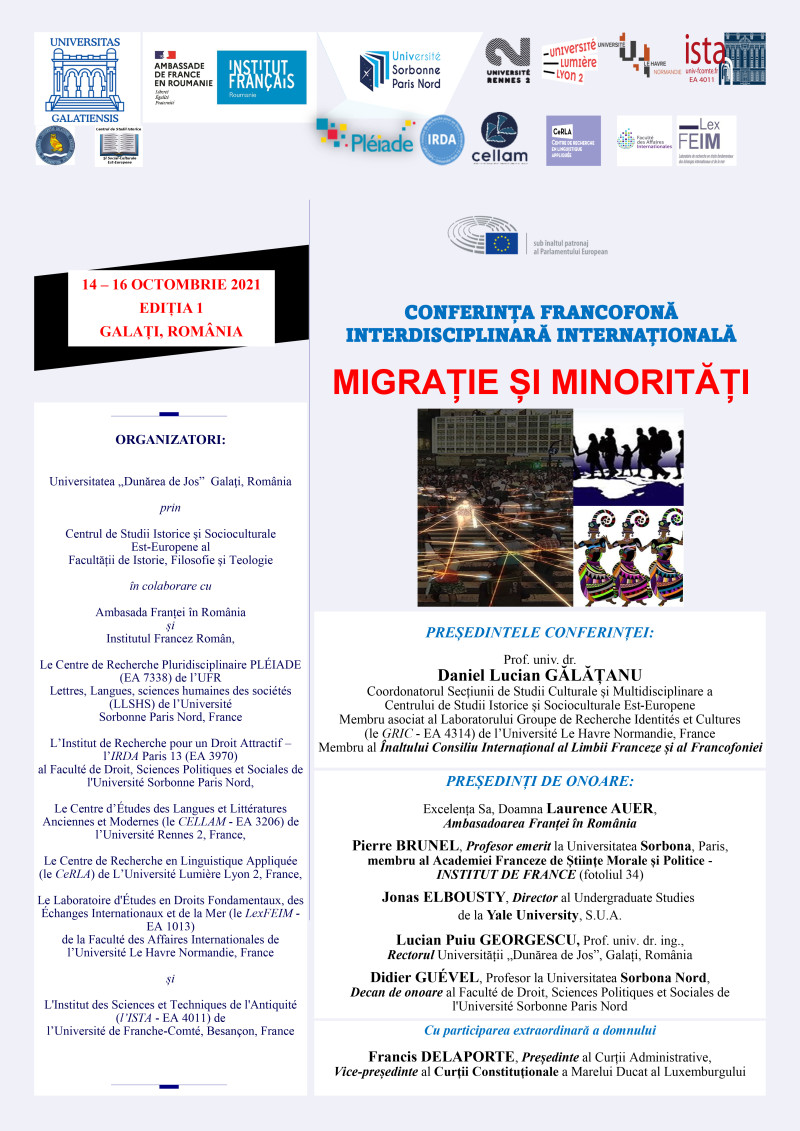 Universitatea „Dunărea de Jos” din Galați organizează, în perioada 14-16 octombrie, prima ediție a CONFERINȚEI FRANCOFONE INTERNAȚIONALE INTERDISCIPLINARE „MIGRAȚIE ȘI MINORITĂȚI”. Evenimentul, care se va desfășura sub Înaltul Patronaj al Parlamentului European, își propune să reunească cercetători din diverse domenii ale științelor umaniste și socio-umane, într-un dialog interdisciplinar dedicat fenomenului migrator și problemelor minorităților.