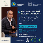 Pe data de 8 noiembrie, începând cu ora 11.00, studenții Universității „Dunărea de Jos” din Galați sunt invitați în Aula Magna pentru a participa la un eveniment deosebit intitulat „Nimeni nu zboară niciodată singur! Dialog despre aspirații și carieră profesională într-o societate diversă”.